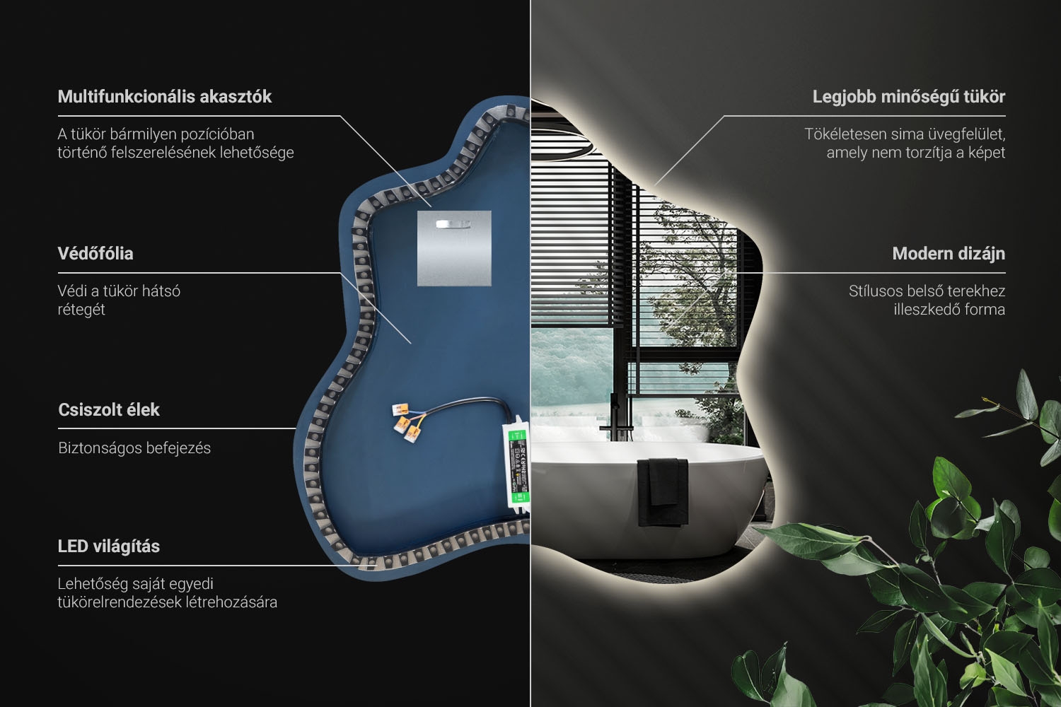 Különböző méretekben elérhető, így ideálisan illeszkedik nappaliba, hálószobába, fürdőszobába vagy előszobába. Keret nélküli megjelenése modern és légies, a tartós fém akasztók és habszivacs távtartók pedig megkönnyítik a felszerelést. Ez a szabálytalan alakú, LED világítással rendelkező tükör tökéletes kombinációja a funkcionalitásnak és a dekoratív hatásnak – kiemeli stílusodat, és egyedivé varázsolja otthonodat.
